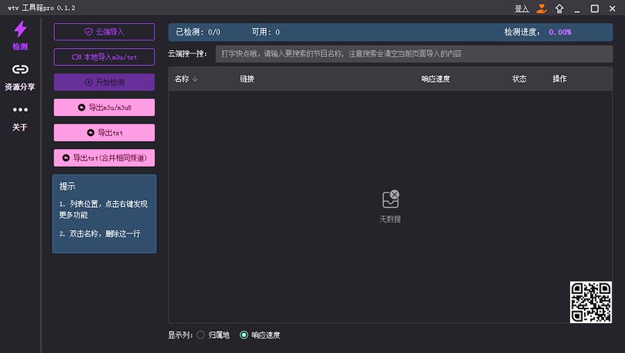 简介:一款主要用于检测电视直播源可用性和速度的软件,支持本地导入或云端导入直播源,可批量检测每个源的速度并导出有效源文件(M3U或TXT格式)。该工具一般用于电视直播源的在线检测,例如筛选出特定地区或网络环境下可播放的节目,可同时检测多个直播源,提升测试效率。