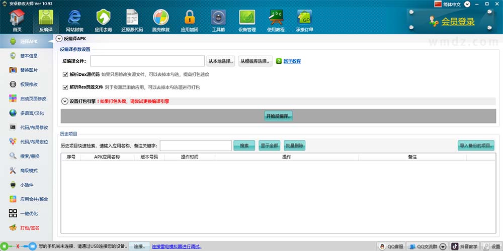 简介:安卓修改大师可以让您轻松将任何APK安装包进行反编译,替换应用程序界面上的任何文字和图片,并且通过代码级别的修改,实现汉化、破解、功能增强,甚至可以在任何的界面添加自定义的代码和功能。本软件还提供多渠道打包工具,无需源代码,直接通过APK安装包进行多渠道打包。本软件提供的反编译功能,仅供安卓开发爱好者对安装包进行反编译研究之用,严禁将反编译之后的安装包作为商业用途。如有违反,与本软件无关。